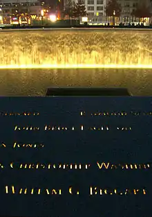 The names of 2,983 victims are inscribed on 152 bronze parapets on the memorial pools:[46] 2,977 killed in the September 11 attacks and six killed in the 1993 World Trade Center bombing. The names are arranged according to an algorithm, creating "meaningful adjacencies" based on relationships—proximity at the time of the attacks, company or organization affiliations (for those working at the World Trade Center or the Pentagon) and in response to about 1,200 requests from family members. Software by Local Projects[47] implemented the arrangement.[48] All names are stylized with Optima typeface for a "balanced appearance"[49]