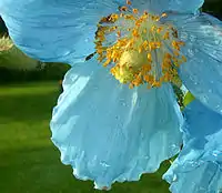 The national flower of Bhutan is the Himalayan blue poppy (Meconopsis gakyidiana). In Bhutan, it grows to a height of 1 meter on the rocky mountain terrain, above the tree line at altitudes of 3500m to 4500m. Bhutanese tradition links this flower with the yeti of lore. The flower was discovered in 1933 by British botanist George Sherriff in remote part of Sakteng in eastern Bhutan.[15]