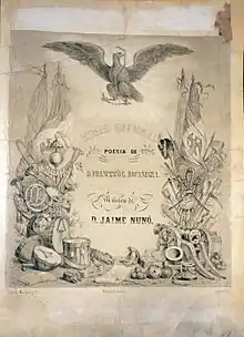 At the same time the lyrics were composed, a set of music was chosen, the winner was Juan Bottesini, but his entry was disliked due to aesthetics. This rejection caused a second national contest to find music for the lyrics.[6] At the end of the second contest, Jaime Nunó, a Spanish-born band leader, arranged the music which now accompanies González's poem. The anthem, consisting of ten stanzas and a chorus, entered into use on September 16, 1854. During the second anthem competition, Nunó was the leader of several Mexican military bands. He had been invited to direct these bands by President Santa Anna, whom he had met in Cuba.