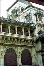 The Naulakha Palace, the oldest extant palace in Gondal, India, dating back to the 18th century (1748) during the reign of Haloji Sagramji, with a "sculpted facade"[1] is a part of the Darbargardh fort complex. It is named "Navalakaha" meaning rupees "nine lakhs" (Rs 900,000) which was the cost of building it at that time.[2] It has stone carvings with "jharokhas" (balconies), a pillared courtyard, delicately carved arches, and a unique spiral staircase. The large chandelier-lit "durbar" hall (court house) witnesses stuffed panthers, gilt wooden furniture, and antique mirrors.[1][3][4][2] The "private palace museum" displays an array of silver caskets which were in the services of carrying messages and gifts for the Maharajah Bhagwat Sinhji on his silver jubilee as ruler of Gondal.[4]