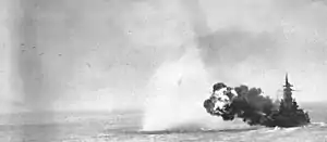 While the covering force engaged El Hank Battery west of Casablanca, seven ships of the French 2nd Light Squadron sortied from Casablanca harbor at 09:00[25] under cover of a smoke screen to attack the troopships anchored off Fedala to the east.[24] The French destroyer Milan sortied with destroyers Fougueux and Boulonnais. At 09:20, the French squadron was strafed by fighter planes from Ranger.[25] French gunners sank a landing craft and scored hits on Ludlow.[28] Milan beached after being damaged by gunfire from Wilkes,[29][30] Wichita, and Tuscaloosa.[23] Massachusetts and Tuscaloosa engaged the French destroyers Fougueux at 10:00 and Boulonnais at 10:12.[30] Fougueux sank at 10:40.[28] The French light cruiser Primauguet sortied with flotilla leader destroyer Albatros and destroyers Brestois and Frondeur. Engaged by Massachusetts, the Primauguet force was outgunned; Primauguet had been under refit and was not fully operational but returned fire nonetheless. The French flotilla was also engaged by Augusta and Brooklyn from 11:00 to 11:20.[30] Albatros beached to avoid sinking. The remaining ships returned to Casablanca harbor where Primauguet beached and burnt out and the two destroyers capsized. Forty-five crew members were killed aboard Primauguet, and more than 200 more wounded. The French submarine Amazone missed Brooklyn with a salvo of torpedoes.[23][29] Sibylle disappeared on a patrol station between Casablanca and Fedala, but the cause of her destruction remains uncertain.[23][31] Surviving French submarines Sidi-Ferruch and Le Conquerant sortied without torpedoes to avoid destruction in the harbor. Le Tonnant managed to load a few torpedoes before leaving. Augusta sank Boulonnais[23] at noon[28] and the only French destroyer remaining operational was L'Alcyon.[24][28]