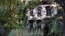 A two-story Surgeon's House (Building R1),[35] designed in the French Second Empire style, was built in 1863 by builder True W. Rollins and civil engineer Charles Hastings.[14][6] The entrance to the house is symmetrical and contains a small pair of steps to a large doorway, with segmental arches and balustrades on either side of the entryway. The facade of the house contains a variety of window designs, including a large bay window on the north side of the first floor, and segmental arch windows on the second floor and at the front side of the first floor.[40][41][6] There are sixteen rooms in the house itself, as well as a servant's quarters.[40] The house also contains a Mansard roof with a full-height attic, as well as dormer windows from the attic that stick out from the slope of the roof.[40][41][6] A curved driveway leads from the main entrance.[41][40] The Surgeon's House is also a New York City designated landmark,[27] having been marked as such in 1976.[38]