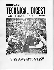 In August 1953, the battalion was reactivated as Mobile Construction Battalion 11 (MCB 11) at Port Hueneme, CA.[16] The battalion did not deploy to Korea. Instead, her first deployment returned the battalion to its last World War II duty station, Subic Bay.[16] The project was constructing Naval Air Station Cubi Point with its adjacent pier. Along with CBs 2, 3, 5 and 9 MCB 11 was involved in the leveling of a mountain that civilian contractors said could not be done. It cost of $100,000,000 in 1956. Adjusted-for-inflation, the cost in today's dollars would be $934,229,168.10.[17] In November 1955 MCB 11 landed on Kwajalein to build Department of Defense housing totaling 78 buildings. On Halloween 1959, the battalion relieved MCB 9 on Okinawa. The job was building base infra-structure: five 100'x400' warehouses, four shops, plus supply and administration buildings.[16] Sent to Midway Island in December 1961, the battalion worked on a seaplane ramp, the station's roads, as well as civilian and military housing. However, MCB 11 had three atypical projects for the Atomic Energy Commission on Kwajalein, Eniwetok, and Nevada. The battalion repaired massive damage caused by the 11 November 1962 arrival of Typhoon Karen on Guam;[16] an advanced party left for the island just days after the storm on 15 November, followed by the main body on 5 December. In 1965 MCB 11 had two Seabee teams sent behind the iron curtain to deal with a bug problem the State Department had discovered in U.S. embassies.[18][19]