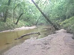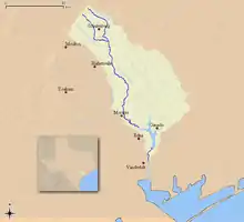 The river begins with two primary branches. The East Navidad River begins in southern Fayette County and runs southeast until it reaches Colorado County.[2] The West Navidad River also begins in Fayette County and wanders south for 23 miles to its confluence with the East Navidad near Oakland, where they become the Navidad River.[3] The town of Schulenburg is centered between the two branches, which are both somewhat seasonal, and navigation can be difficult due to low water levels and obstructions.[4]