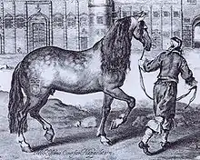 The Neapolitan Horse, Italian: (Cavallo) Napoletano, Neapolitano or Napolitano, is a horse breed that originated in the plains between Naples and Caserta, in the Campania region of Italy,[1] but which may have been bred throughout the Kingdom of Naples.[2] The Neapolitan horse was frequently mentioned in literature from the 16th to the 19th centuries, and is noted for its quality. Corte wrote in 1562: "in Italy the horses of the Kingdom of Naples are greatly esteemed; [there] many fine coursers are born ... suitable for use in war and in the manège and for every service that the rider may require".[3] The decline of the breed was noted in the early 20th century by Mascheroni (1903) and Fogliata (1908).[1] Some sources state that by 1950,[4] the original Neapolitan horse was deemed extinct, but its lines were incorporated into other breeds, most notably the Lipizzaner.[5][6] However, a breed called the Napolitano exists in Italy today, and is recognized by the Italian government.[1] According to Gouraud, "a dedicated breeder ... is hoping to be able to rebuild it".[7] La Repubblica reports that the attempt is based on a single stallion, Neapolitano "Il Vecchio", which belonged as a foal to Marshal Tito and passed when old to a Serbian farmer, from whom it was purchased and imported to Italy in 1989.[8]