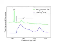 The fundamental phenomenon underlying XANES is the absorption of an x-ray photon by condensed matter with the formation of many body excited states characterized by a core hole in a selected atomic core level (refer to the first Figure). In the single-particle theory approximation, the system is separated into one electron in the core levels of the selected atomic species of the system and N-1 passive electrons. In this approximation the final state is described by a core hole in the atomic core level and an excited photoelectron. The final state has a very short life time because of the short life-time of the core hole and the short mean free path of the excited photoelectron with kinetic energy in the range around 20-50 eV. The core hole is filled either via an Auger process or by capture of an electron from another shell followed by emission of a fluorescent photon. The difference between NEXAFS and traditional photoemission experiments is that in photoemission, the initial photoelectron itself is measured, while in NEXAFS the fluorescent photon or Auger electron or an inelastically scattered photoelectron may also be measured. The distinction sounds trivial but is actually significant: in photoemission the final state of the emitted electron captured in the detector must be an extended, free-electron state. By contrast, in NEXAFS the final state of the photoelectron may be a bound state such as an exciton since the photoelectron itself need not be detected. The effect of measuring fluorescent photons, Auger electrons, and directly emitted electrons is to sum over all possible final states of the photoelectrons, meaning that what NEXAFS measures is the total joint density of states of the initial core level with all final states, consistent with conservation rules. The distinction is critical because in spectroscopy final states are more susceptible to many-body effects than initial states, meaning that NEXAFS spectra are more easily calculable than photoemission spectra. Due to the summation over final states, various sum rules are helpful in the interpretation of NEXAFS spectra. When the x-ray photon energy resonantly connects a core level with a narrow final state in a solid, such as an exciton, readily identifiable characteristic peaks will appear in the spectrum. These narrow characteristic spectral peaks give the NEXAFS technique a lot of its analytical power as illustrated by the B 1s π* exciton shown in the second Figure.