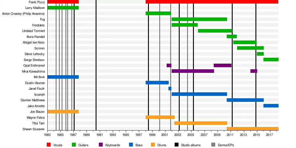 - Frank "Killjoy" Pucci – vocals (1983–1987, 1998–2018; died 2018)