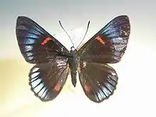 There are three species which all have colourful iridescent markings. They are forest insects. Some are part of mimetic complexes.