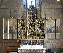 Among the church furnishings, the altarpiece is the most noteworthy. It dates from circa 1520 and was made in Antwerp. Its central part contains intricately carved figures depicting the Passion of Christ.[2][3] The altarpiece is one of the finest of its kind in Sweden.[3] The congregation is supposed to have paid the sum of 900 silver marks, in cash, for the altarpiece – a great sum for the mostly peasant congregation.[2][3] Among other furnishings, the triumphal cross and the marble baptismal font date from the late Middle Ages.[2] The richly carved pulpit dates from 1712.[1] Some of the pews are medieval, while some were at least elaborated in 1749.[1][3] The organ dates from 1971.[2]