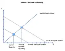 A positive externality (also called "external benefit" or "external economy" or "beneficial externality") is the positive effect an activity imposes on an unrelated third party.[33] Similar to a negative externality, it can arise either on the production side, or on the consumption side.[19]