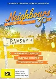 In November 2014, FremantleMedia Australia confirmed that a special show celebrating Neighbours' 30th anniversary would air on Network Ten in March 2015.[1][2] The following month, it was announced that the special would be a 90-minute documentary.[3] Michael Lallo of The Sydney Morning Herald confirmed former co-stars Kylie Minogue, Jason Donovan and Guy Pearce would be involved.[2] Network Ten's drama chief Rick Maier commented that the documentary includes scenes from the show and "an affectionate nod" to Labrador Retriever Bouncer.[2] It also clears up some myths about the show's ratings after its move from Channel Seven to Network Ten.[2]
