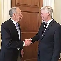 Gorsuch's nomination was first considered by the Senate Judiciary Committee, which holds hearings on all federal judicial nominations and decides whether or not to send nominations to the full Senate for a final confirmation vote.[34] In the 115th Congress the committee consisted of 11 Republicans and 9 Democrats, and was led by Republican Chuck Grassley. In preparation for the hearing, the committee requested the Department of Justice (DOJ) to send all documents they had regarding Gorsuch's work in the George W. Bush administration; and by the time the hearing commenced, the DOJ had sent the committee over 144,000 pages of documents and, according to a White House spokesman, more than 220,000 pages of documents altogether.[35] Gorsuch's confirmation hearing started on March 20, 2017, and lasted four days.[8][36]