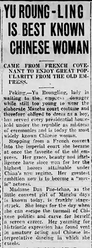 - "Best Known of Chinese Women Movie 'Struck': Yu Roungling, Lady in Waiting to Empress Dowager, Highly Favored". San Pedro Daily News. Los Angeles. 9 April 1926. Retrieved 4 February 2022.