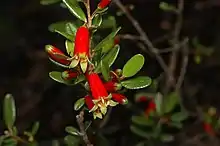 Nematolepis phebalioides is an upright shrub to 3 m (9.8 ft) high. The leaves are on ascending branches on a short petiole, elliptic to broadly elliptic shaped, about 15 mm (0.59 in) long, leathery, smooth, glossy on the upper surface, grey scales on underside and rounded at the apex. The flowers are borne singly in leaf axils, corolla tubular about 15 mm (0.59 in) spreading, pendulous, on a pedicel about 3 mm (0.12 in) long with small bracts, boat-shaped and close to the base of the calyx. The sepals are triangular or rounded, about 1.5 mm (0.059 in) long, smooth or with occasional scales. The red, smooth, bell-shaped floral tube is 10–15 mm (0.39–0.59 in) long, 5 petalled with short yellow or green lobes and yellow stamens. The dry fruit capsule is about 5 mm (0.20 in) high, square, finely wrinkled and ending in a short triangular point. Flowering occurs sporadically throughout the year, mostly in winter.[2][3][4]