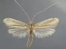 The wingspan is 14–17 mm. Head orange. Forewings long, light shining greyish-ochreous, indistinctly strigulated with grey ; a grey discal mark beyond middle. Hindwings light grey ; cilia whitish-grey.[2]