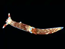 Nembrotha lineolata grows to a length of about 70 millimetres (2.8 in). The body is slender with a rounded head at one end and a pointed tip to the foot at the other. The exterior of the body is covered with longitudinal wrinkles and there is no sharp demarcation between the dorsal surface and the lateral surfaces. The oral tentacles are thick and long and the large conical rhinophores bear about thirty lamellae and can be retracted. The three large pinnate branchial plumes on the dorsal surface are non-retractile and the anus is located between them. The colouring of this nudibranch is variable across the animal's range. The body colour is creamy-white with narrow longitudinal lines, some broken, in varying shades of brown. Sometimes these lines merge in places giving transverse bands of colour. There is a blue or purple stripe running round the margin of the foot and often a yellow one as well. The oral tentacles are blue or purple with a yellow band and the rhinophores are red (sometimes yellow in the Comoros Islands) with blue or purple sheaths.[2][3]