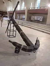For centuries large numbers of lead bars have been found on the Mediterranean seabed, and there was debate over whether they were anchor stocks or not. It was argued by some that iron tipped wooden anchors secured by ropes were not heavy enough to be effective so they had to have metal stocks and there was considerable academic controversy over the issue. The Nemi ships, constructed during the transition period when iron anchors were replacing wooden ones, were the first Roman wrecks found to have intact anchors, and confirmed that the lead bars were indeed anchor stocks.[9] Two types of anchor were found, one of oak with iron-tipped flukes and a stock of lead while the other was of iron with a folding timber stock that closely matched the design of the Admiralty pattern anchor re-invented in 1841. In the 1960s, a similar anchor was found in Pompeii and in 1974 another was found buried near Aberdarewllyn in Gwynedd, Wales. These further discoveries confirmed that these technologically advanced anchors were a standard Roman design.[9]