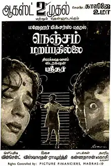 Nenjam Marappathillai (transl. The Heart Never Forgets) is a 1963 Indian Tamil-language film written and directed by C. V. Sridhar. The film stars Kalyan Kumar and Devika, while M. N. Nambiar, S. V. Sahasranamam, Nagesh, Padmini Priyadarshini and Manorama play supporting roles. It focuses on a college boy who, while exploring a dilapidated villa, learns all the details about his past life.