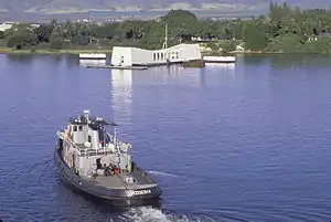 ![]() Neodesha (YTB-815) approaches the USS Arizona (BB-39) Memorial at Naval Station Pearl Harbor in December 1984. | |