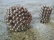 Two objects made of neodymium magnets. The right object has the Close-packing of equal spheres.