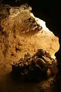 The Mines of Spiennes cover some 100 ha (250 acres) of downland four miles south-east of the city of Mons. The site is dotted with millions of scraps of worked flint and numerous mining pits, that Neolithic settlers have gradually turned into vertical mine shafts to depths of over 10 m (33 ft). Underneath is an elaborate man-made network of caverns accessible via the many shafts.[2][6]