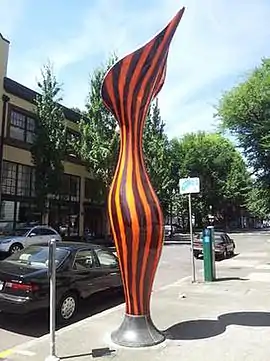 Nepenthes is a series of four sculptures by Dan Corson. Located along Northwest Davis Street between Fifth and Eighth Avenues,[1] the pieces are inspired by the genus of carnivorous plants of the same name, commonly referred to as tropical pitcher plants.[2] According to Corson and the Regional Arts & Culture Council (RACC), which maintains the sculpture series, the work and genus are named after the "magical Greek potion that eliminates sorrow and suffering".[2][3] The agency said that Nepenthes "insert[s] a quirky expression of nature into an urban environment" and celebrates the "unique and diverse community" of Portland's Old Town Chinatown neighborhood.[2][3] Each bulbous-shaped sculpture is nearly 17 feet (5.2 m) tall and glows in the dark due to photovoltaics.[1]