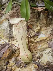 Rosette and lower pitchers are ovoid in the lowermost quarter and cylindrical above, frequently widening just below the peristome. They are up to 20 cm high and 4 cm wide. On the inner surface, the glandular region covers the ovoid portion of the pitcher cup. The pitchers lack wings, bearing a pair of ribs instead. The pitcher mouth is round and has an oblique insertion. The flattened peristome may be up to 5 mm wide. Its inner margin is lined with indistinct teeth.[12] The inner portion of the peristome accounts for around 29% of its total cross-sectional surface length.[17] The lid is sub-orbicular and lacks appendages. The spur is up to 4 mm long and generally bifid.[12]