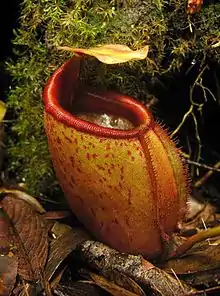 Rosette and lower pitchers are wholly ovate to urceolate. They grow up to 20 cm high by 7 cm wide. A pair of wings up to 12 mm wide runs down the ventral surface of the pitcher cup. These wings bear filiform fringe elements up to 10 mm long. The pitcher mouth is oval to circular and up to 6 cm across. It has an oblique insertion and rises at the rear to form a conspicuous neck. The peristome is cylindrical to slightly flattened and up to 2 cm wide for most of its length, becoming broader towards the neck (≤3 cm wide). It bears ribs up to 2 mm high and spaced up to 2 mm apart, which terminate in teeth (≤4 mm long) on the peristome's inner margin. The digestive zone usually covers the entirety of the pitcher's inner surface. The pitcher lid or operculum is elliptic and measures up to 6 cm in length by 4.5 cm in width. It lacks appendages or a keel. A spur is inserted near the base of the lid. It measures up to 9 mm in length, with a basal diameter of up to 2 mm, although it may be much smaller.[2]