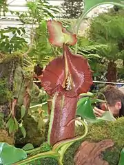 | Lower pitchers of N. robcantleyi at the 2011 Chelsea Flower Show. The pitcher in the foreground is fully developed, with mature colouration; a developing, unopened pitcher is visible in the background (top-right). | |