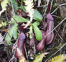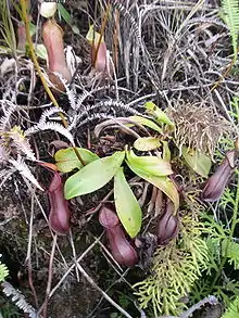 Nepenthes tobaica is very abundant in the Lake Toba region,[10] to the point where it is "difficult to avoid seeing it there".[5] N. tobaica is also known to grow in high altitude peat swamp forest near Lake Kerinci, at an altitude of 1100 m. At this location, the species grows alongside N. ampullaria, N. gracilis, N. mirabilis, N. reinwardtiana, and N. spathulata. The Nepenthes species and hybrids at this site exhibit high levels of introgression. The vegetation is dominated by species of the genera Rhododendron and Melastoma, as well as orchids and ferns. It is very stunted and dense, with few trees exceeding 3 m in height. It is somewhat reminiscent of the highland heath forests around Bareo in Sarawak, Borneo.[5]