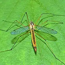 Nephrotoma cornicina can reach a body length of 12–15 millimetres (0.47–0.59 in) and a wing length of 11–15 millimetres (0.43–0.59 in).[5] On the wings the stigma is quite small, brown or black, clearly distinct. These flies have slender-bodies, with elongate an rather narrow wings and very long and slender legs. Ocelli are absent and the occipital mark is black. Flagellum is entirely black. Abdomen is mainly yellow, with a dark median stripe, sometimes absent on tergites 6 and 7. In males sternite 8 shows a straight rather long appendage directed at caudal margin. Tergite 9 is short and rather broad, swollen and rounded towards sides. The females have a pointed shiny brown ovipositor with a black basal half, for laying eggs into the ground.[6][7][8][9]