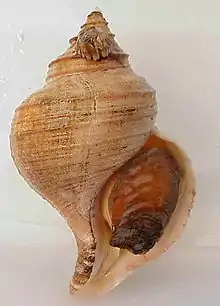Abapertural view of the shell of Neptunea pribiloffensis.
