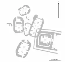 Structure 8 is roughly contemporary with structure 1, probably having been built just after structure 1 was completed.[16] It comprised ten piers and ten recesses, and had six hearths. The remains of at least two earlier buildings lie beneath it and structure 8 appears to have undergone severe subsidence itself. Its floor slumped in antiquity, causing the roof to fall in, and some of its stones were used to form structure 10.[16]