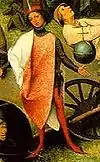 The Flemish artist Frans Hogenberg made an engraving illustrating 43 proverbs in around 1558, roughly the same time as Bruegel's painting.[6][7] The work is very similar in composition to Bruegel's and includes certain proverbs (like the Blue Cloak) which also feature prominently in Netherlandish Proverbs.[7] By depicting literal renditions of proverbs in a peasant setting, both artists have shown a "world turned upside down".[7]