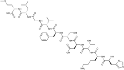 Neurokinin A (formally known as substance K) is a member of the tachykinin family of neuropeptide neurotransmitters. Tachykinins are important contributors to nociceptive processing, satiety, and smooth muscle contraction. Tachykinins are known to be highly excitatory neurotransmitters in major central neural systems.[3] Neurokinin A is ubiquitous in both the central and peripheral mammalian nervous systems, and seems to be involved in reactions to pain and the inflammatory responses. It is produced from the same preprotachykinin A gene as the neuropeptide substance P. Both substance P and neurokinin A are encoded by the same mRNA, which when alternatively spliced can be translated into either compound.[2] It has various roles in the body of humans and other animals, specifically stimulation of extravascular smooth muscle, vasodilation, hypertensive action, immune system activation, and pain management. The deduced amino acid sequence of neurokinin A is as follows:[4]