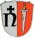 The uncial N with the cross on top is the sign that the old Neustadt Monastery, founded about 770 by Bishop of Würzburg Megingoz, used to mark its estate. In 993 the monastery passed to the Princely Electorate (Hochstift) of Würzburg, remaining with that state until Secularization in 1803. Recalling this former allegiance are the tinctures argent and gules (silver and red), those borne by the Electorate. The waved sword was taken from a village court seal from the early 18th century that showed Saint Michael with a sword. The arms have been borne since 1968.[11]