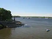 Whereas most tourist attractions of Neva are located within St. Petersburg, there are several historical places upstream, in the Leningrad Oblast. They include the fortress Oreshek, which was built in 1323 on the Orekhovy Island at the source of Neva River, south-west of the Petrokrepost Bay, near the city of Shlisselburg. The waterfront of Schlisselburg has a monument of Peter I.[42] In the city, there are Blagoveshchensky Cathedral (1764–95) and a still functioning Orthodox church of St. Nicholas, built in 1739. On the river bank stands the Church of the Intercession. Raised in 2007, it is a wooden replica of a historical church which stood on the southern shore of Lake Onega. That church was constructed in 1708 and it burned down in 1963. It is believed to be the forerunner of the famous Kizhi Pogost.[43][44]