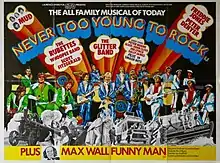 Never Too Young To Rock is a 1975 British musical comedy movie directed by Dennis Abey and stars Peter Denyer and Freddie Jones and features various music artists popular at the time of release such as The Glitter Band, The Rubettes, Mud, Scott Fitzgerald, Slik and Bob Kerr's Whoopee Band.