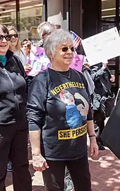 Feminists and supporters of Senator Warren immediately adopted as a rallying cry the three-word sentence, "Nevertheless, she persisted."[11][12] It has been referenced with hashtags such as "#Shepersisted", and "#LetLizspeak", and it has been called a "hashtag-ready motto for women at the ready to break barriers".[5] According to BuzzFeed, the quotation was shared on social media along with pictures of strong women "who refused to be silenced".[13] Amy Wang of The Washington Post observed,[14]