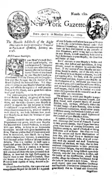![]() Front page of the New-York Gazette issue for April 7–14, 1729. | |