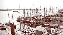 Ten thousand men worked in the whaling industry. During this period, New Bedford's population increased from approximately 4,000 in 1820 to about 24,000 in 1860.[23] At the height of the whaling industry in 1857, the harbor hosted 329 vessels worth over $12 million, and New Bedford became the richest city per capita in the world.[24]