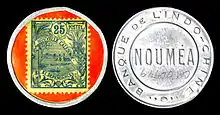 Between 1914 and 1923, postage stamps were used to make emergency issue currency.[1] The first issues were pieces of cardboard to which stamps were affixed in denominations of 25 and 50 centimes, 1 and 2 francs, with the 50 centime denominations made from either a single 50 centime stamp or a 15 and a 35 centime stamp.[1] The second issue from 1922 consisted of 25 and 50 centime stamps encapsulated in aluminum.[1]