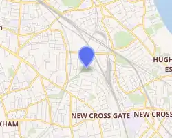 New Cross Stadium, Hornshay Street, Old Kent Road, in South East London was opened in the early 1900s as an athletic stadium but was mainly used for greyhound racing and speedway. The ground was adjacent to The Old Den,[1] the then home of Millwall F.C. and was used as a training ground by the club when they did not have facilities of their own. The track was often referred to as 'The Frying Pan'. It was built inside the greyhound track and had banking all the way round.[2] At the time of its closure in 1969 the stadium had a capacity of 26,000.[3] The stadium was demolished in 1975.