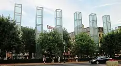 Each tower symbolizes a different major extermination camp (Majdanek, Chełmno, Sobibor, Treblinka, Bełżec, and Auschwitz-Birkenau), as well as menorah candles, the six million Jews murdered in the Holocaust (one million per tower), and the six years that the mass extermination took place, 1939-1945.[5] Each tower consists of twenty-four individual panels of glass. Twenty-two of the panels are inscribed with seven digit numbers and two of the panels are inscribed with messages. In total, there are 132 panels from the six towers inscribed with numbers; however, each panel is identical. A single panel contains 17,280 unique numbers which are subsequently repeated throughout the memorial. Numbers are arranged in eight by ten blocks, with each block consisting of sets of six numbers arranged in a six by six grid. In total there are 2,280,960 non-unique numbers listed on the 132 panels. A digital tour, which explains some holocaust history and meaning behind the monument, is available through QR codes as of July 2021.[6]