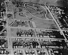 Opinions vary as to the exact location of the racetrack itself. During the 1880s the land once owned by Thomas Adams was marketed for subdivision as the "Old Racecourse Estate", but allotments 28 to 30 included both the site of New Farm Park, as well as the land to the north of the small creek that formed the park's north-eastern boundary. In 1895, Merthyr Road was known as "Old Racecourse Road", and in 1913 the annual report of Henry Moore referred to the "old racecourse paddock" that was to become "New Farm Park". A 1925 aerial photo (John Oxley Library) appears to show the remains of the track on the site of the Colonial Sugar Refining Company Refinery and the site of the Powerhouse, intersected by Lamington Street near the river.[1]