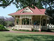 The bandstand in the shape of a rotunda was also built in the Federation Queen Anne style. In July 1915 the £359 tender of Legge, Gladwin and Co was accepted, construction to take 6 weeks.[3] Until the kiosk burnt down in 2000, it was one half of the last surviving kiosk-bandstand related group in Queensland. A kiosk and bandstand were built in Albert Park in 1911, a bandstand at Bowen Park (1914), and kiosks were built in the City Botanic Gardens, Moora Park (Sandgate) and Mount Coot-tha Lookout.[1]