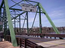 The New Hope–Lambertville Bridge is a six-span, pin-connected Pratt through truss containing 962 tons of steel.[4] Its total length is either 1,045 or 1,053 feet (321 m), depending on the source. Each span measures 171 feet (52 m).[5] The bridge supports a cantilevered walkway on its southern side for pedestrians.
