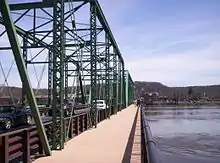 The New Hope–Lambertville Bridge, officially called the New Hope–Lambertville Toll Supported Bridge, is a six-span, 1,053-foot (321 m)-long bridge spanning the Delaware River that connects the city of Lambertville in Hunterdon County, New Jersey with the borough of New Hope in Bucks County, Pennsylvania, United States.[2] The current steel truss bridge was constructed in 1904 at a cost of $63,818.81.[3] It is owned and maintained as a toll-free bridge by the Delaware River Joint Toll Bridge Commission.