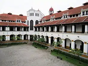 One example is the former offices of the Dutch steamtram company Joana Stoomtram Maatschappij in Semarang by Thomas Karsten (1930).[8] The ground plan of this single-storeyed building is identical to that of a traditional Javanese Joglo: tall columns support a hipped, two-tiered roof, which facilitates cross ventilation of the roof cavity.