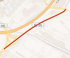 Route 185 is a short one-block-long state highway in Jersey City in the U.S. state of New Jersey, between Route 440 and Linden Avenue. Route 185 is a 0.65-mile (1.05 km) freeway in the Greenville neighborhood of Jersey City. It is parallel to Interstate 78 (the Newark Bay Extension of the New Jersey Turnpike) on the eastern side. On Route 440, signs pointing the way to Route 185 imply that the highway runs directly to Liberty State Park. In reality, the freeway ends at Linden Avenue, and travelers must journey one city block west to Caven Point Road, which continues north to Liberty State Park. At Route 185's junction with Route 440, the thru lanes of the Route 440 freeway northbound actually continue north as Route 185, and traffic wishing to continue on Route 440 must actually exit the freeway. Route 185 opened on February 25, 1988 at only 23% of its proposed routing.